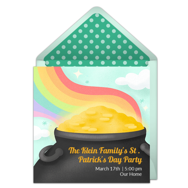Sleepover parties are always fun but a St. Patrick's Day overnight complete with an arts and crafts project and tasty treats puts a new twist on a traditional sleepover party. Send online St. Patrick's Day party invitations to invite your child's friends over for a St. Patrick's Day themed sleepover party!  Customize your favorite design, send via text or email, and easily manage RSVPs online.