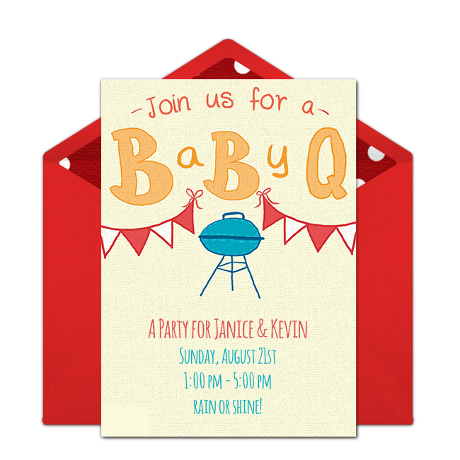 Summertime is the perfect time for BBQs! Send this cute Baby-Q baby shower invitation or this Ribs & Bibs baby shower invitation, available in yellow, pink, or blue to set the scene for your grilling celebration. Place traditional red and white checkered table cloths throughout yoru party space and place mason jars filled with wildflowers on each table. Decorate with red and white bunting, balloons, and streamers.Serve mini sliders, ribs, and barbeque chicken with plenty of BBQ side dishes and ice cream for dessert. For party favors, give guests mini bottles of barbeque sauce to take home.