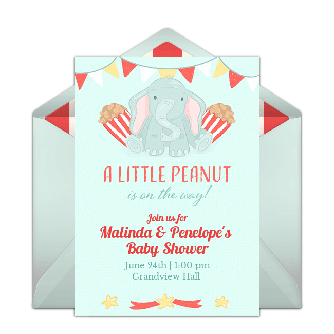 A carnival summer baby shower theme is definitely festive and fun! First, send carnival baby shower invitations featuring a cute elephant, peanuts, and bunting. Next, decorate with primary colors, create bouquets of balloons to scatter throughout the venue, and set up a photo booth with lots of fun carnival-themed props for guests to pose with. Hang bright streamers, paper lanterns and red-and-white beach balls all over the venue. Serve peanuts, popcorn, soft pretzels, and old-fashioned soda-pop in glass bottles. Make a candy bar using all of the mom-to-be's favorites and let guests take home little bags as favors. carnival-baby-shower-invitations.png269.31 KB