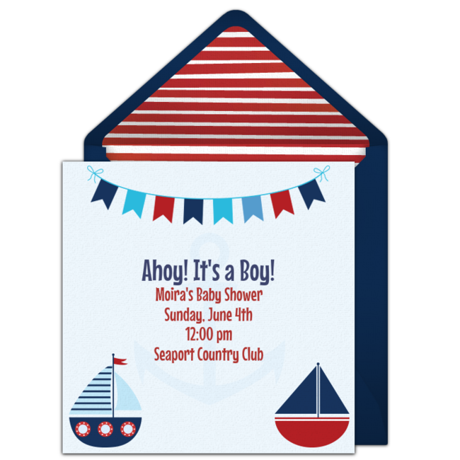 Set sail for cool waters with a nautical baby shower theme! To start, add important event details to this Nautical baby shower invitation featuring an anchor or this Red & Blue nautical baby shower invitation featuring cute boats. Once you send your invites, decorate with classic nautical colors like navy, red, and white. Incorporate toy boats, anchors, and whales or fish throughout your space. Serve various seafood like crab cakes, tuna sandwiches, and lobster rolls and provide mini deli sandwiches for those who might not like seafood. Finally, let guests leave with cute anchor key chains to remember the special celebration.