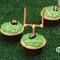 Set aside 24 pretzel rods for the base of each goal post. Cut the remaining sticks into three 1 inch pieces. Then, melt the white chocolate chips following the package directions. Dip the edge of the goal post base pretzel into the melted white chocolate and then attach it to the middle of one of the smaller pretzel pieces so that it is perpendicular. The two pretzel pieces should now look like the letter “T.” Dip each edge of the smaller pretzel piece into the white chocolate and attach the remaining two smaller pretzel pieces to the edges. The pretzels should now look like a goal post. Place them on wax paper to dry and repeat for the remaining pretzels. Once the pretzel goal posts have cooled, carefully peel them from the wax paper and insert them in the top of each cupcake.