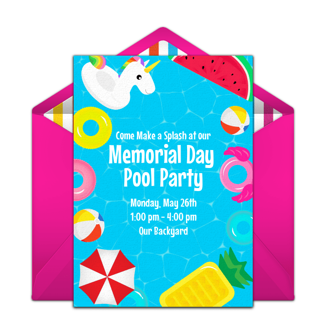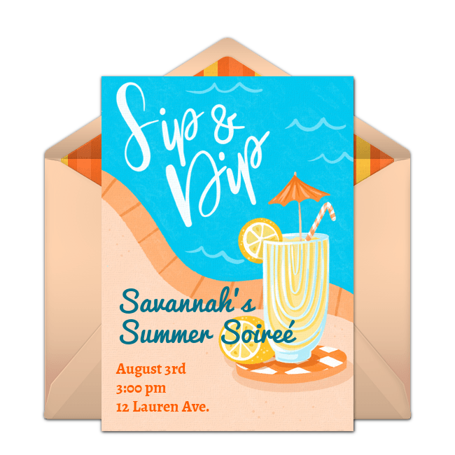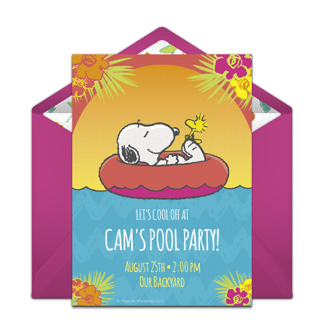 Once the guest list and logistics are worked out, send out festive online pool party invitations a few weeks in advance to let everyone know the details of the party. Browse designs that are perfect for kid or adult pool parties, like the pool float invitation, Sip & Dip invitation, tropical pool party invitation, and Snoopy pool party invitation pictured below. In your invitation, ask guests to bring their own towel and set a rain date if you're worried about bad weather. When your invitation is ready, deliver it instantly by text or email and easily track RSVPs online.