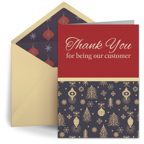 - Vintage Ornament Thanks eCard: Thank customers for their support with this gorgeous design that features holiday ornaments and a matching envelope liner.