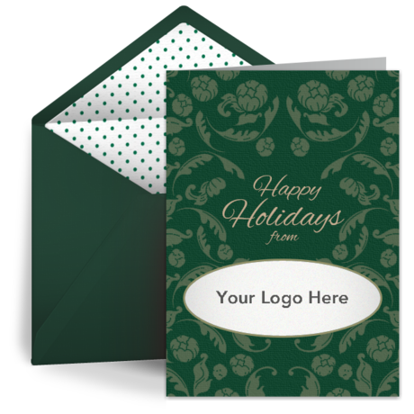 - Green Custom Logo Holiday eCard: Upload your company’s logo to this festive holiday greeting card that has beautiful floral accents and a polka dot envelope liner.