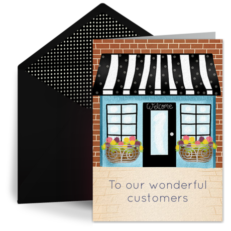 - Thank You Customers eCard: Wish your customers a happy holiday season and thank them for their support with this beautiful design that features a warm and welcoming entrance to a small business.