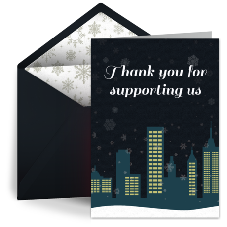 - Snowy City Thanks eCard: Share your gratitude with clients, customers, and partners this holiday season with this design featuring a beautiful, snowy city landscape.