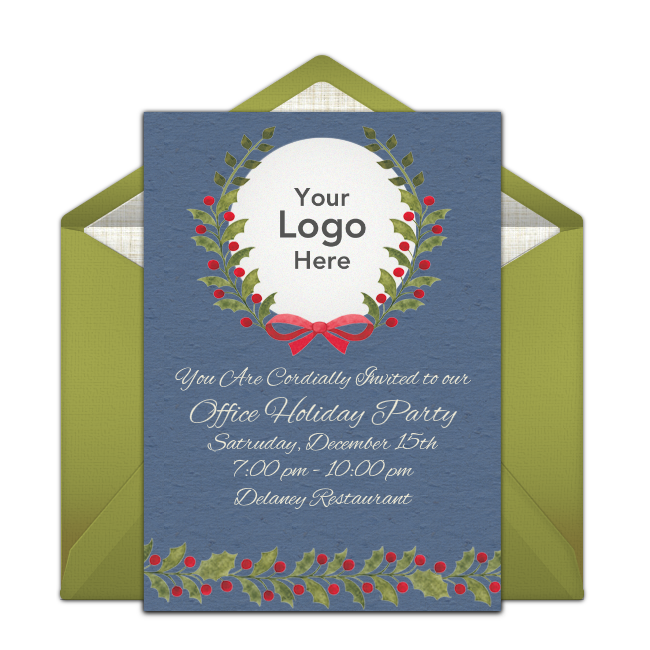 - Corporate Holiday Party Invite: Upload your company’s logo to this beautiful holiday invitation that features sprigs of holly throughout.