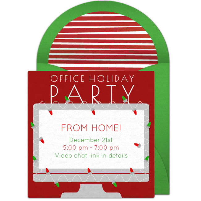 - Office Holiday Celebration Invite: A festive computer monitor wrapped in holiday lights sets the stage for a fun virtual office party. Easily include a video chat link for everyone to gather online.