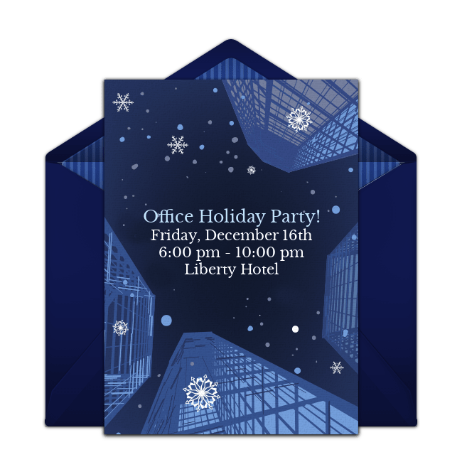 - Winter Skyscrapers Invite: Tall buildings set against a midnight blue, snow-filled sky make this the perfect invitation for a holiday office party.