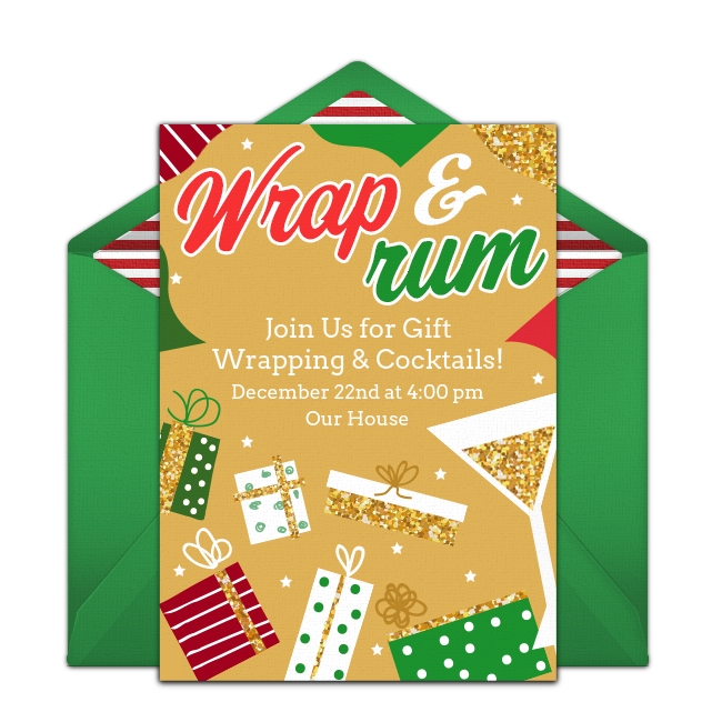 Kick things off with a festive Wrap & Rum invitation and let guests know to bring gift wrap and bags, tissue paper, tape, scissors, ribbons, bows, and gift tags. As the host, you should also be sure to have plenty of these supplies on hand in addition to fun drinks like Hot Rum Toddies or Candy Cane Martinis. For food, serve simple snacks like cheese and crackers, dried fruits, nuts, and pretzels so busy fingers can grab a bite and get back to work!