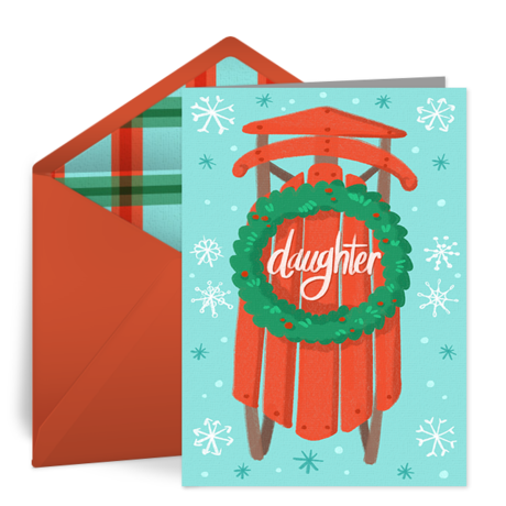 Send special Christmas wishes and love to your daughter with this merry design that features a sled and Christmas wreath set against a winter backdrop. Include a digital gift card for a sweet surprise your daughter will love!