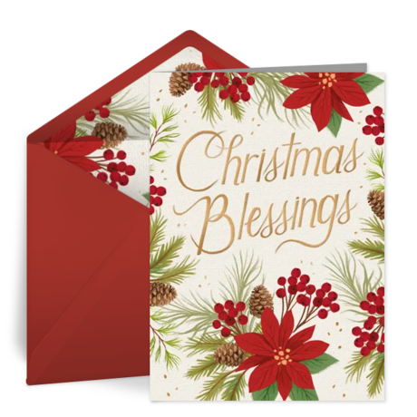 Beautiful handwritten script paired with poinsettias, berries, and winter pinecones give this Christmas card a festive touch. This eCard features a matching envelope liner and stamp, and plenty of room to wish loved ones a blessed holiday season.