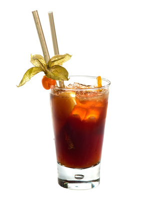Mix ingredients together over ice in a glass. Pour into shaker and shake once. Pour back into the glass and make sure there is fizz on top. Garnish with cherries.