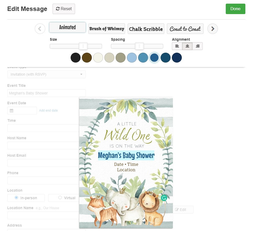 First - when you create an invitation from one of our online templates, you can enter the title of your event and choose the style of how that title will appear. Different fonts in different colors, sizes, spacing, alignment, and more. You just have to highlight the text that you want to edit in order to get started. When you've created the perfect look for your invitation, you can continue to the next step!