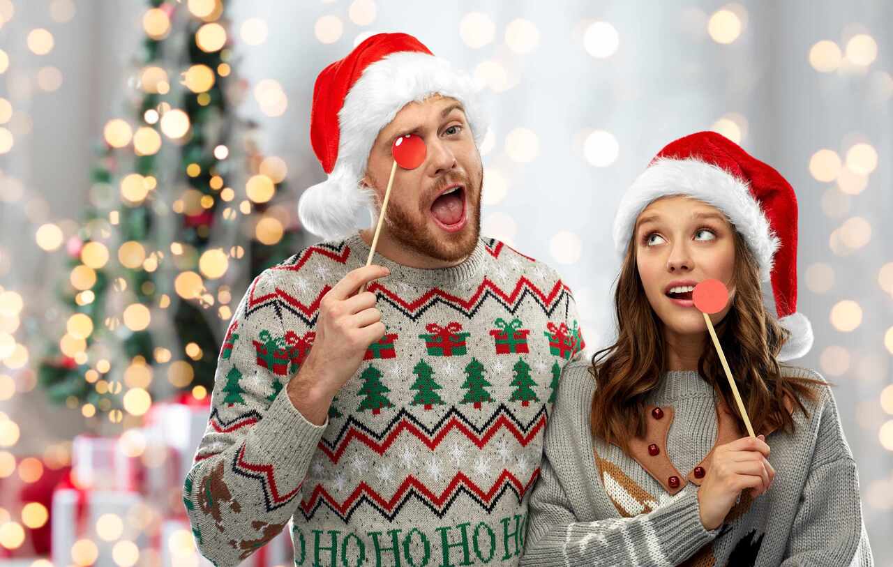 Ugly Sweater Photo Booth When you’ve asked your guests to dress up in their holiday best (or ugliest in this case!), it’s always a good idea to give them plenty of selfie opportunities. Set up an Ugly Sweater photo booth area. Tape two long strips of holiday wrapping paper to a wall as your backdrop, and provide some fun props. A wreath for a photo frame, reindeer antlers, and a Santa beard are all popular options. Make sure there’s some decent lighting in that particular corner, and a little sign that let’s everyone know it’s a photo booth!