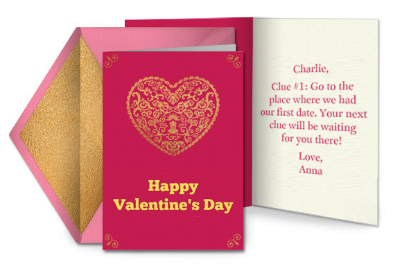 First, brainstorm key places you can send your partner. Think of the place you first met, had your first kiss or your first date, your favorite restaurant, etc. Begin the scavenger hunt by sending your leading man/lady their first clue. You can include the clue in one of Punchbowl's customizable free Valentine eCards.