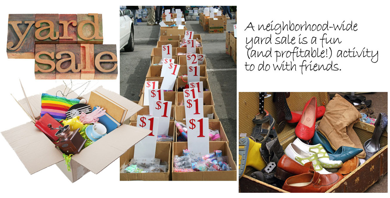 An organized tag sale among neighbors is a perfect way for everyone involved to make a little extra money AND spend time together. Establish a list of families that would like to participate and settle on a date that works for the majority (including a rain date!). Since a tag sale is a lot of work, suggest that after it's over, everyone chip in some money to order pizza and have a very casual "dinner" party to relax and reflect on the day.