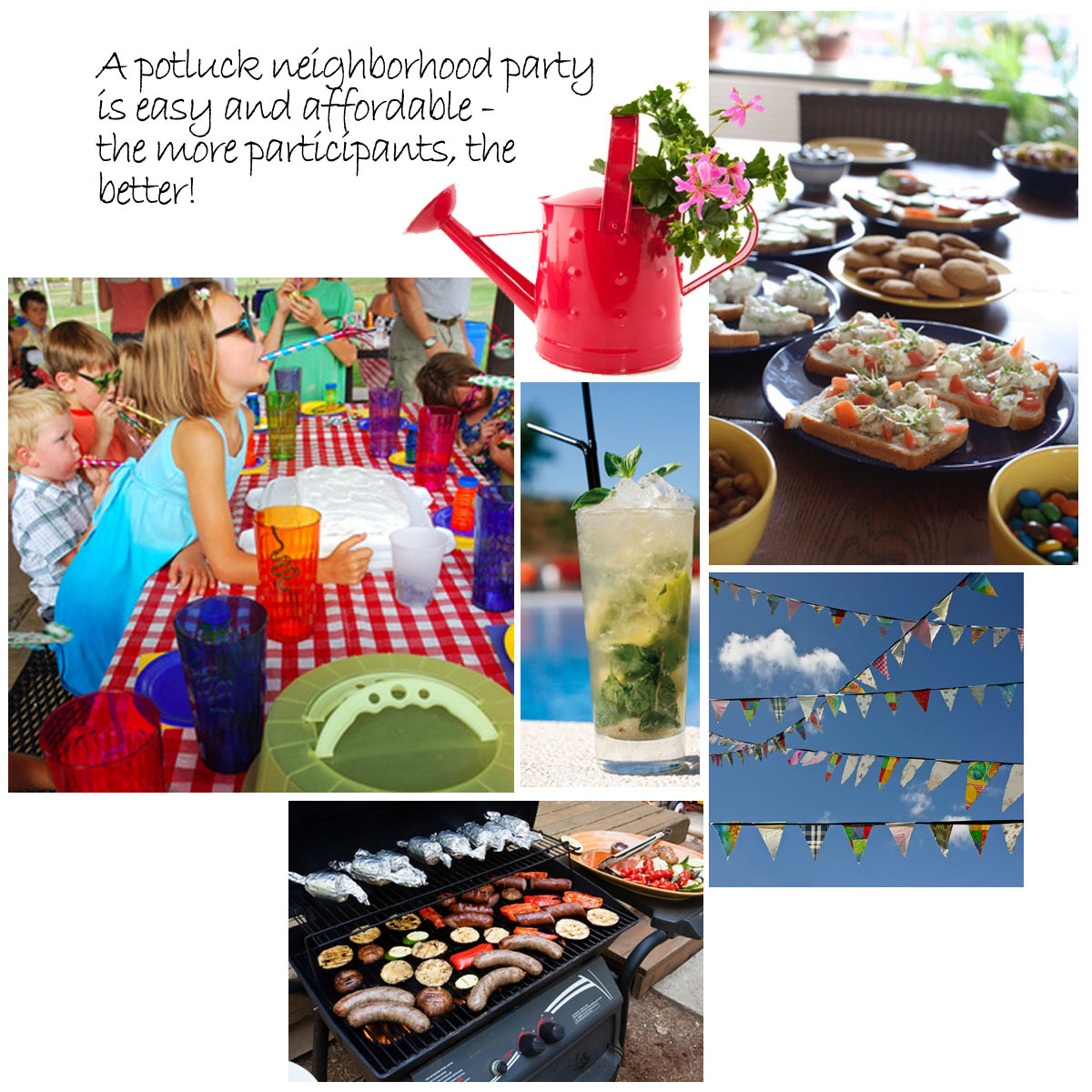 Food Ideas: Have the host do the main course (BBQ on the grill, pasta, pizza,etc.) and suggest other dishes to guests to get the ball rolling. Whet your appetite with these yummy sides and cocktail recipes: