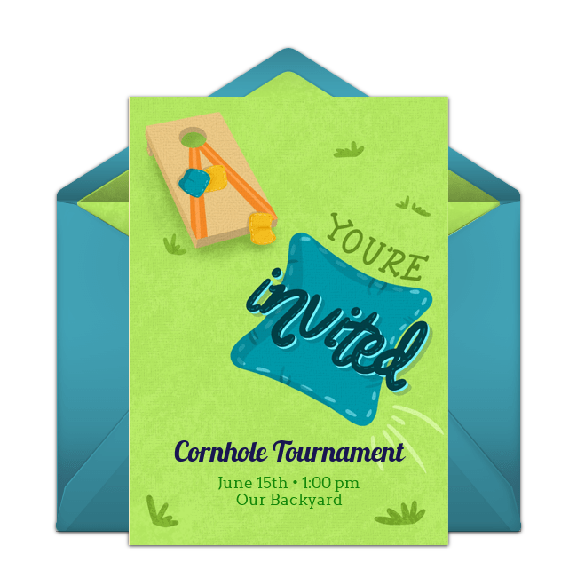A neighborhood game night doesn't have to be arranged way in advance, just ask neighbors to meet at a host's house and each bring a game that can be played outdoors (board games count too!). Schedule the event after dinnertime and just serve appetizers, a casual drink bar, and some desserts. Browse online Game Night invitations or send outdoor game invitations like a Cornhole Tournament invite or Bocce Ball Tournament invite.
