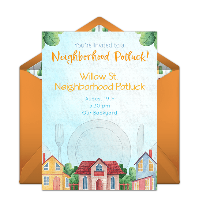 The pros of throwing a neighborhood potluck party are endless - it's cheap, it's diverse, there's very little preparation, and on and on! Set the stage for your event with digital invitations like the Neighborhood Potluck invitation below to start your planning off on the right foot.